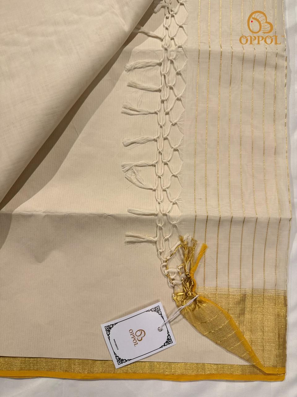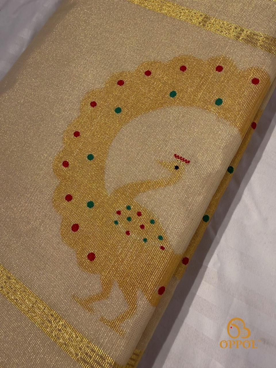 Bring home a timeless piece of Kerala elegance with this Oppol kasavu saree featuring a shimmering tissue pallu woven with statement peacock motifs. The pallu showcases a circular peacock design highlighted with delicate multicolour accents, giving a playful yet classic festive feel. The soft off‑white body is adorned with evenly spaced golden polka dots that keep the look minimal, airy and graceful.