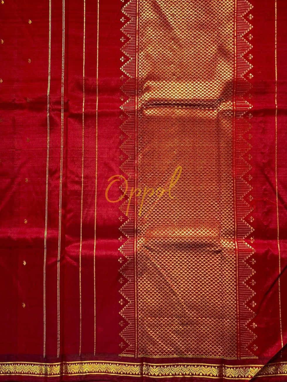 The highlight of Raktika Samriddhi is its grand pallu, featuring the intricate Araimadam pattern, a hallmark of Tamil Nadu’s silk legacy. The border and pallu echo the same majestic maroon hue, interwoven with rich golden zari that dances in the light, ensuring an heirloom finish. The blouse mirrors the saree’s opulent shade, allowing for seamless styling and understated sophistication.